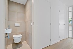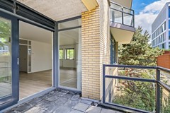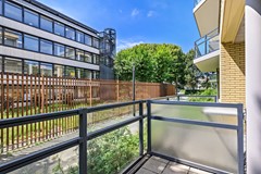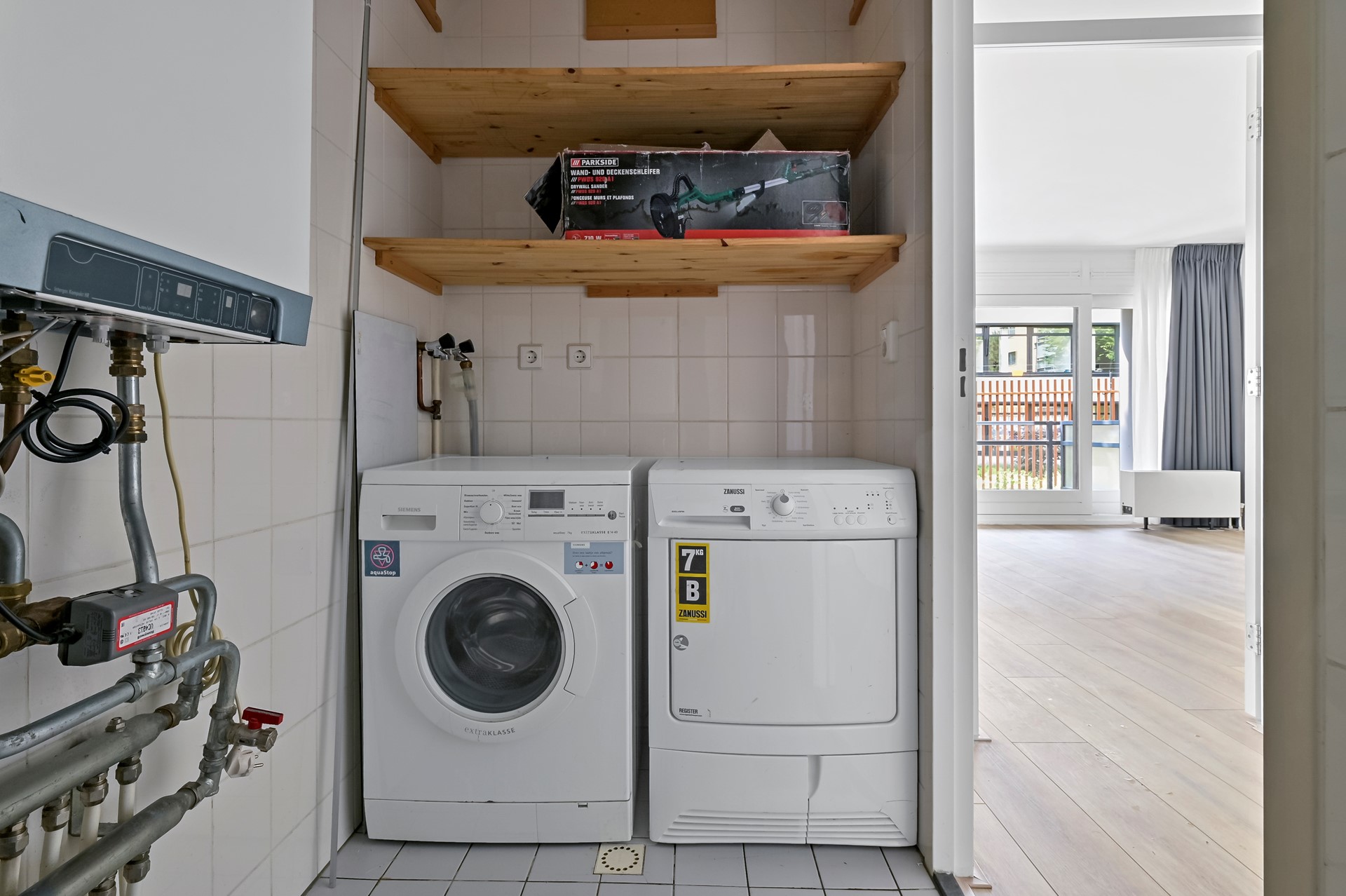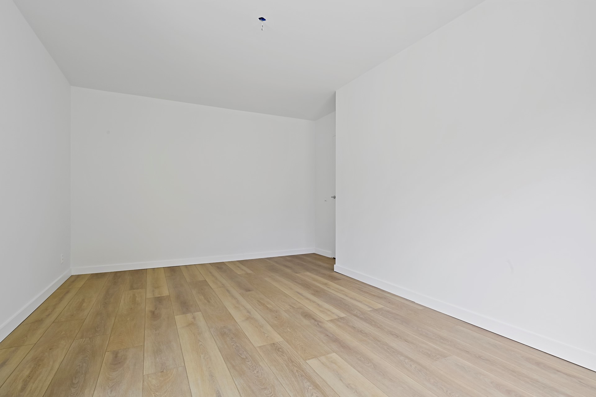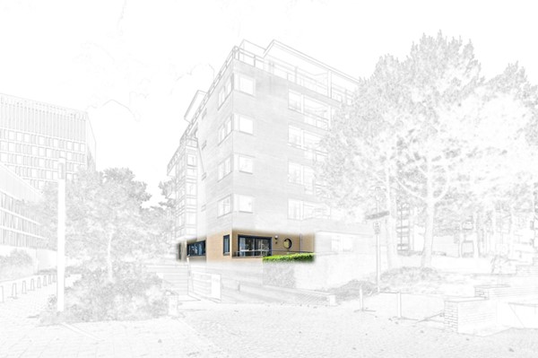 Entrance to the apartment on the ground floor. The apartment has a spacious hall with separate toilet and a practical indoor storage room with connections for a washing machine and dryer. The bright living and dining room is spacious and wonderfully sunny thanks to the large windows. From here, there is direct access to the southwest-facing balcony. The semi-open kitchen connects nicely to the living room and is equipped with modern built-in appliances such as a refrigerator, freezer, oven, dishwasher, and stove.