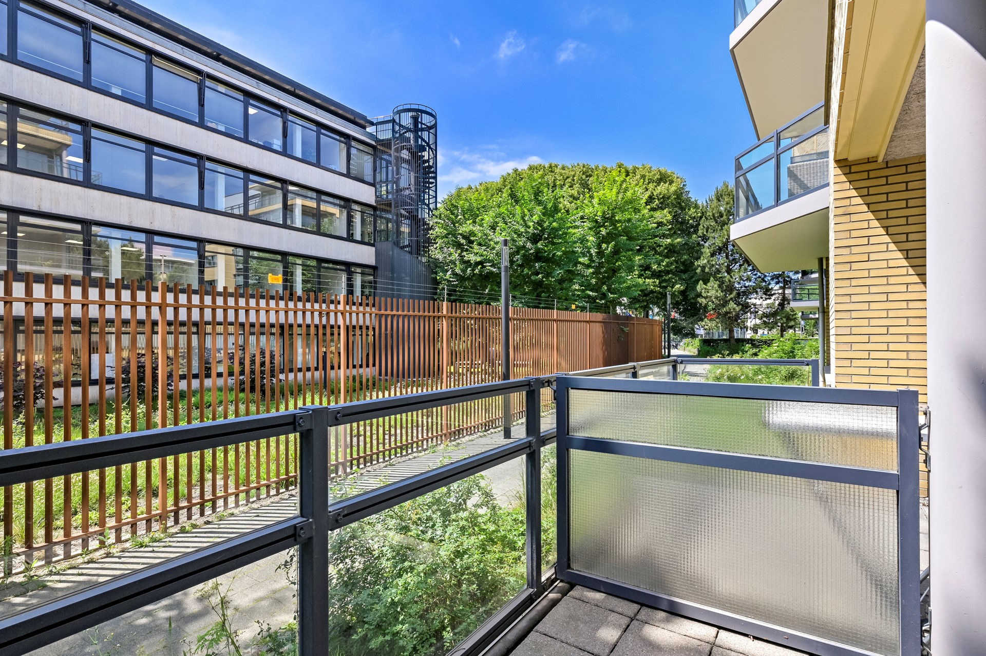 The apartment has two good-sized bedrooms: a master bedroom of approximately 17 m² and a second bedroom of approximately 10 m², which is also ideal as a study or guest room. The bathroom is luxuriously finished and equipped with a bathtub, walk-in shower, sink, and second toilet. The master bedroom opens onto a spacious terrace of approximately 23 m², facing northeast, perfect for breakfast in the morning sun or relaxing outside later in the day.