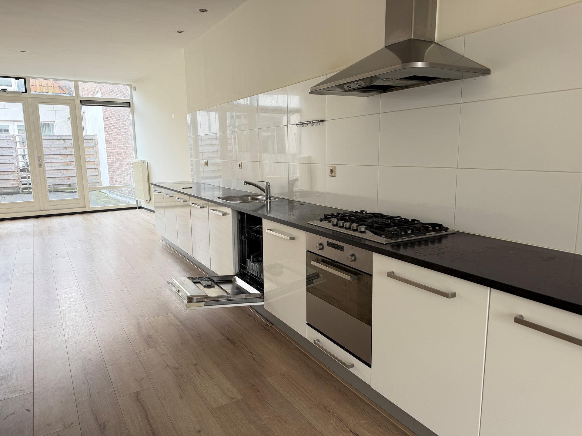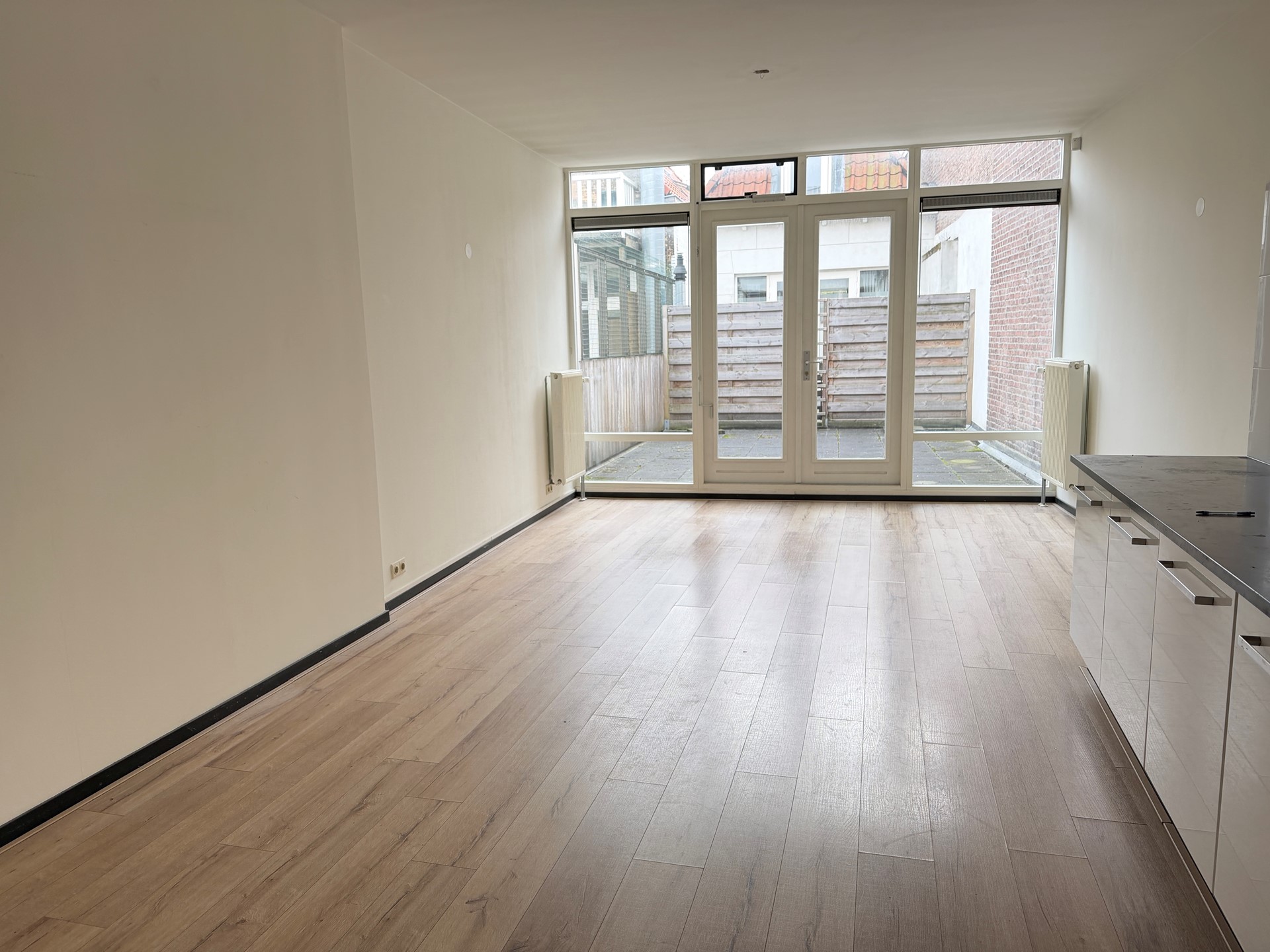 De royale doorzonwoonkamer kenmerkt zich door de grote raampartijen en het overvloedige daglicht. Via openslaande deuren is het zonnige terras direct bereikbaar, wat zorgt voor een prettige verbinding tussen binnen en buiten.
