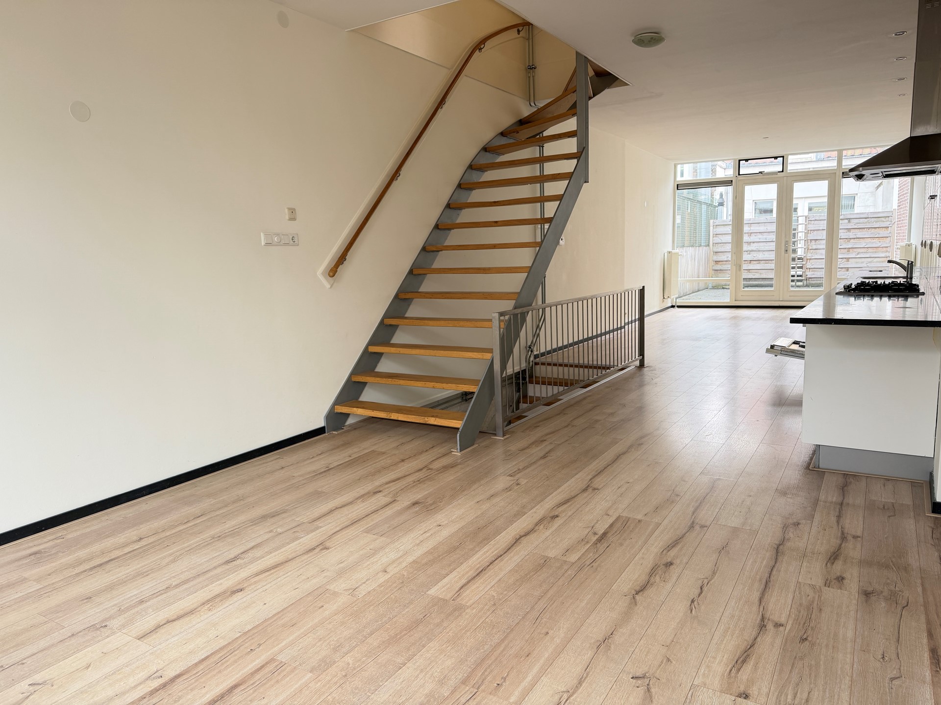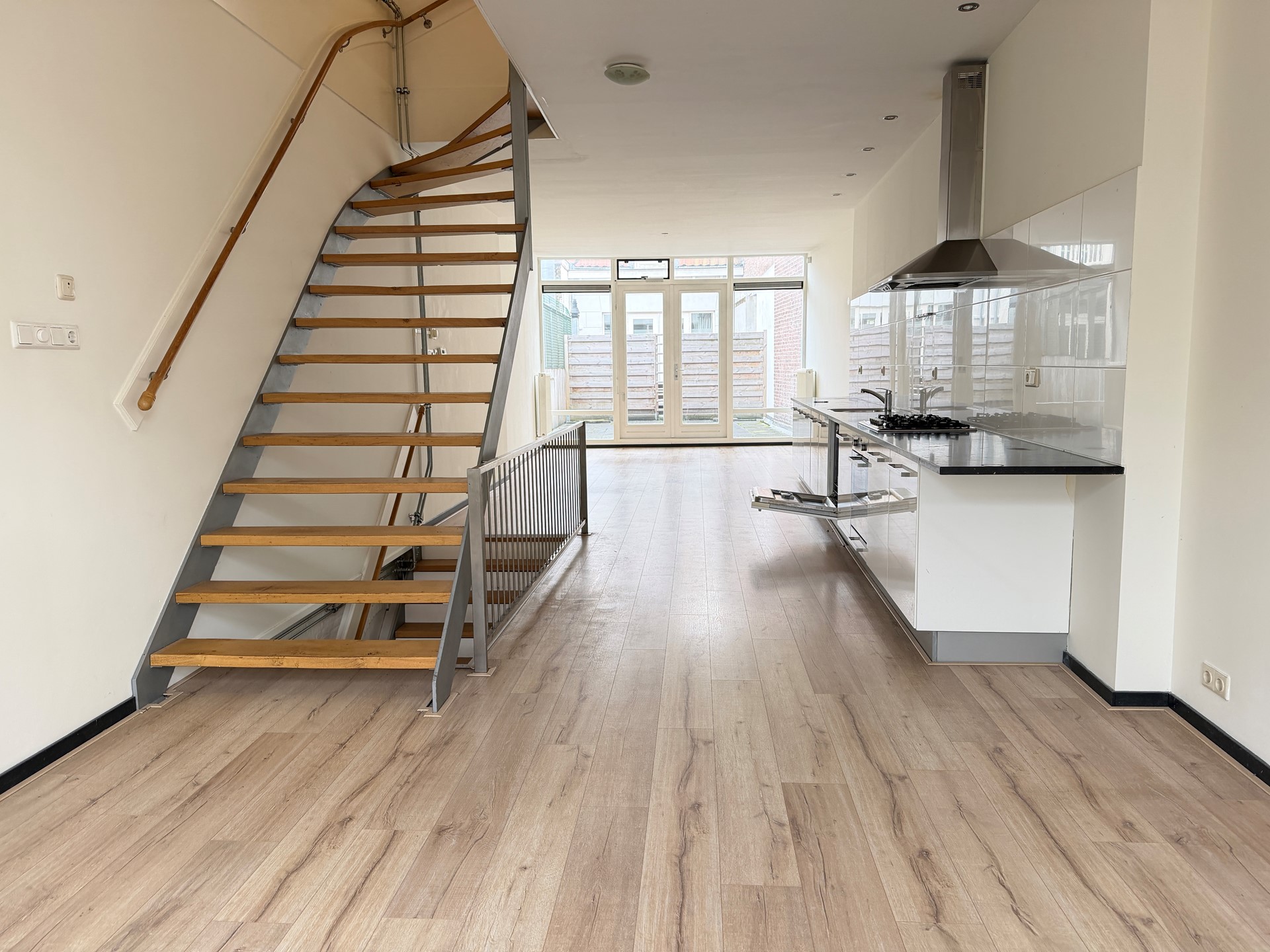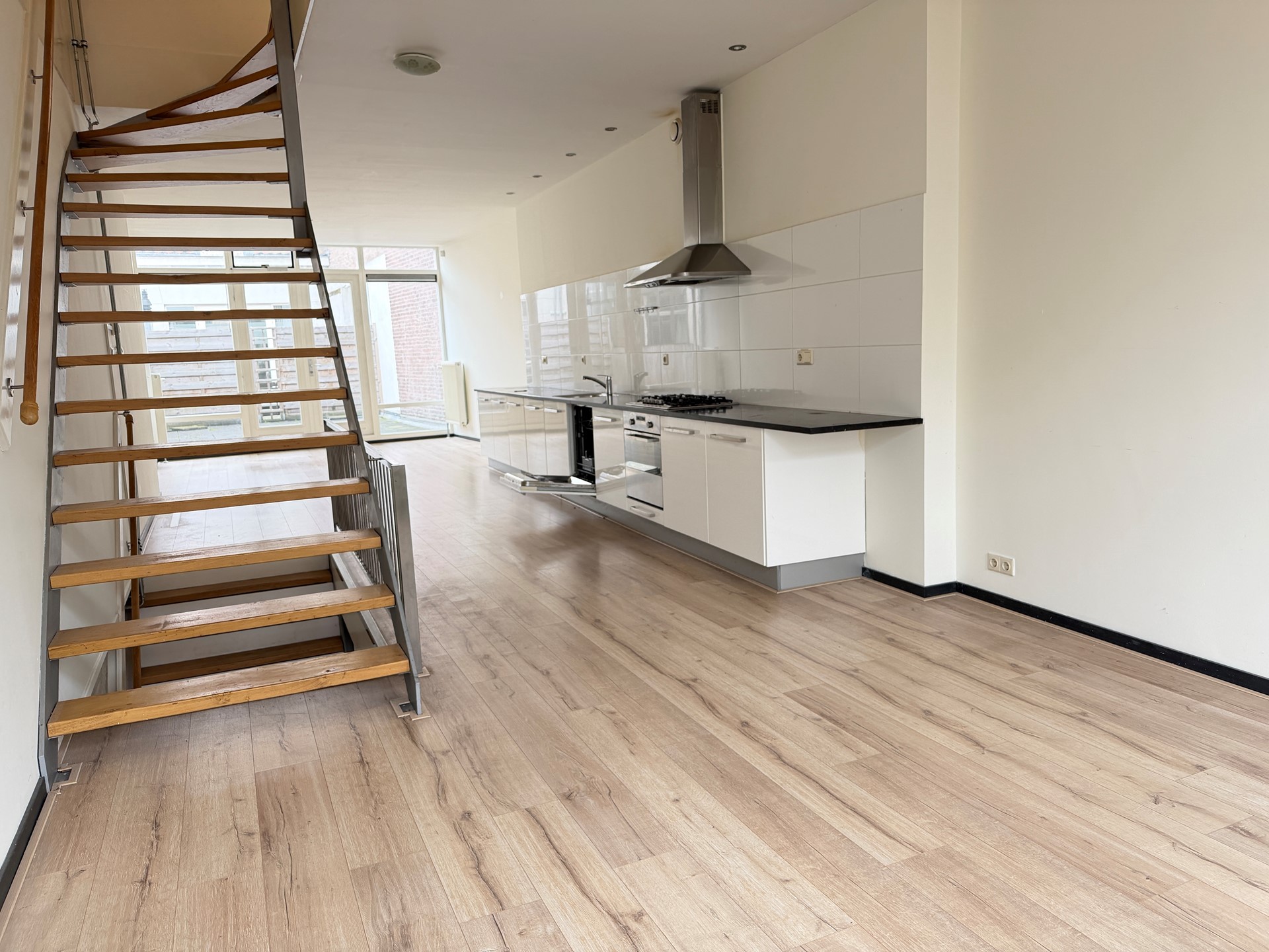Vanuit de hal leidt een trap naar de eerste verdieping, waar zich de open en lichte woonkamer met keuken bevindt. De keuken is voorzien van onder andere een vaatwasser en gaskookplaat.