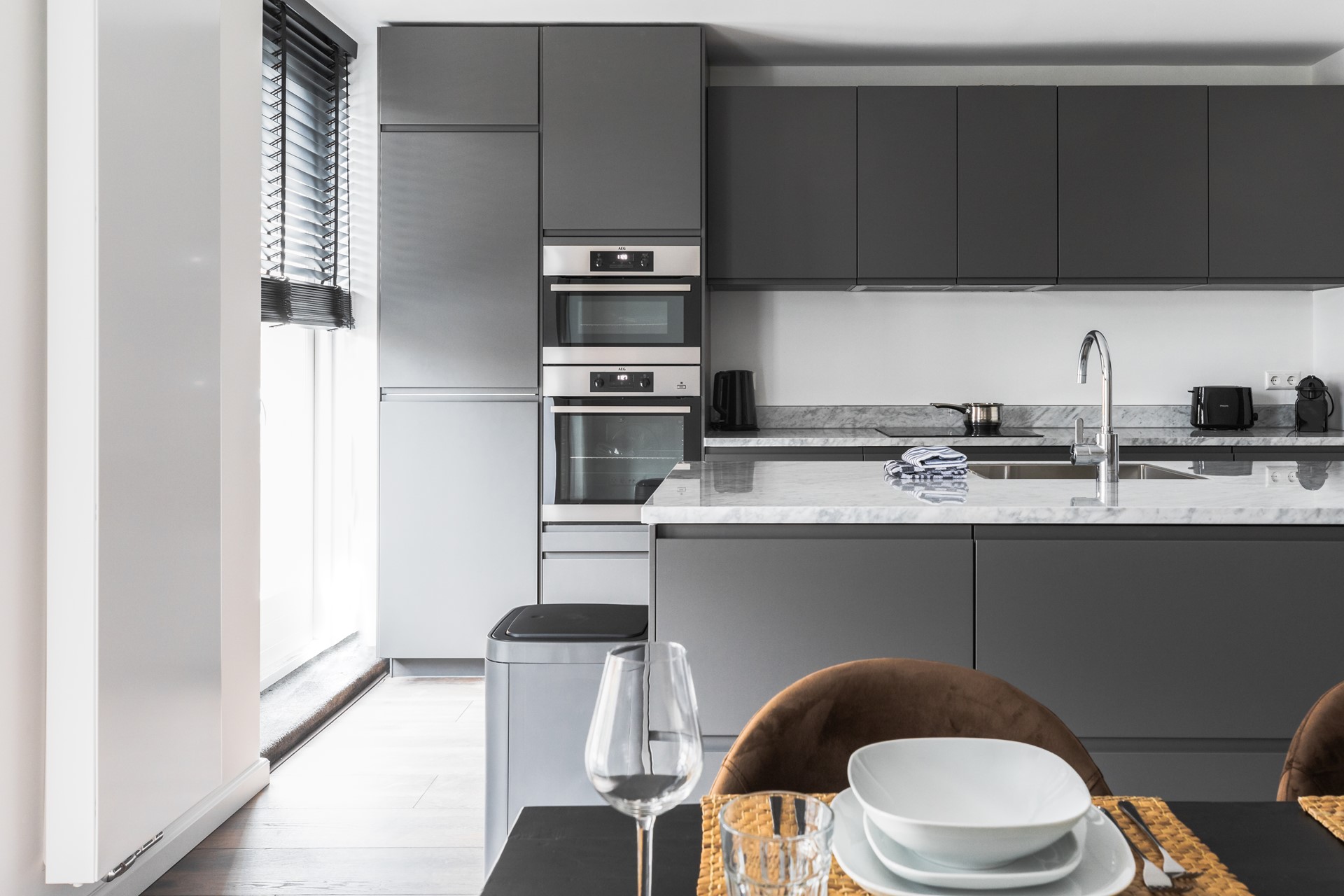 Gebruikt u de trap of lift om naar het appartement te komen? U komt binnen in een heerlijke woonkeuken met 6-persoons eettafel. Deze hoogwaardige keuken is voorzien van alle luxe gemakken zoals een kookeiland, oven en magnetron, vaatwasser, elektrische kookplaat, ruime ijskast en vriezer en voldoende opbergruimte. Vanuit de woonkeuken kunt de deuren open slaan naar een geheel eigen privé terras gelegen op het zuidoosten.