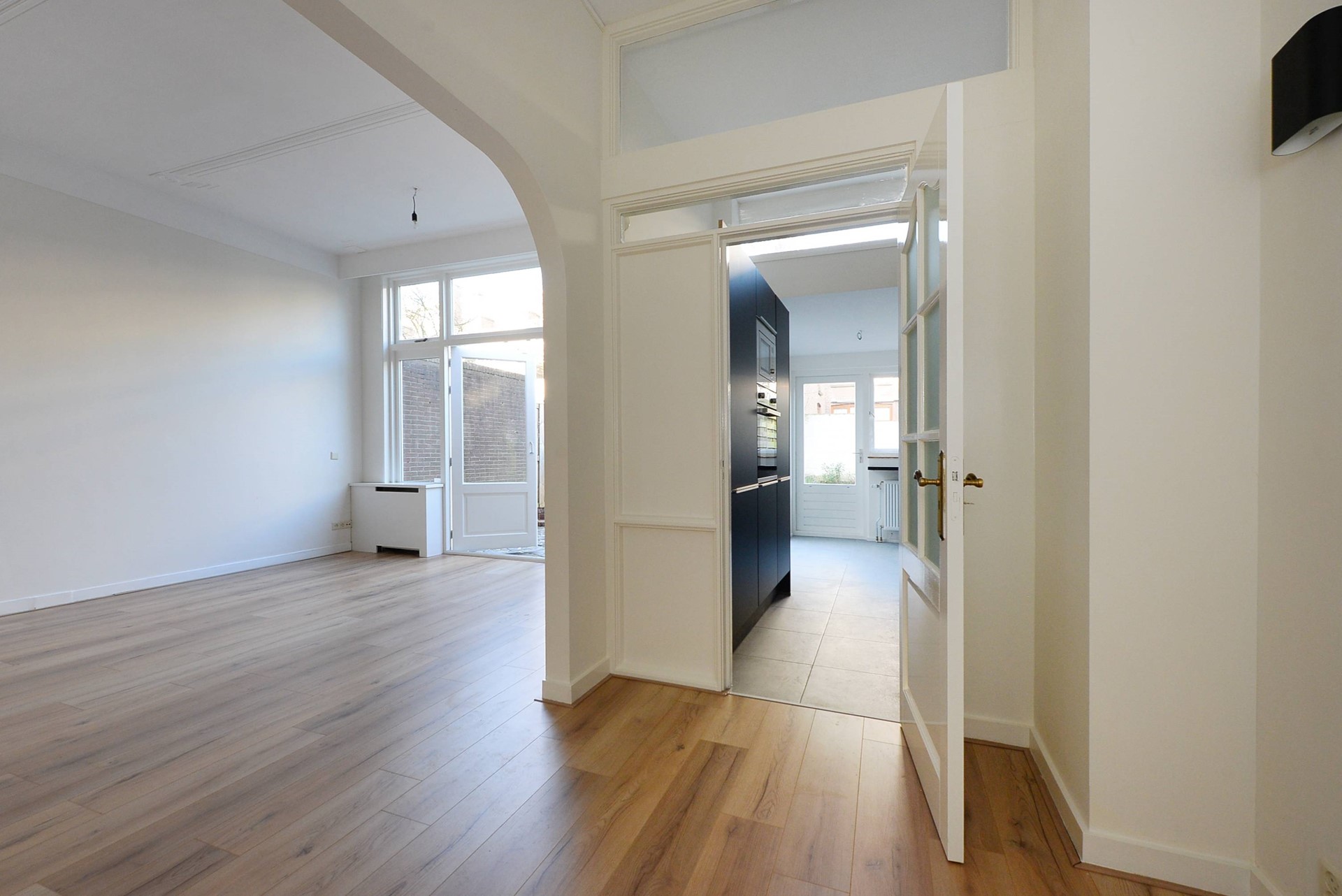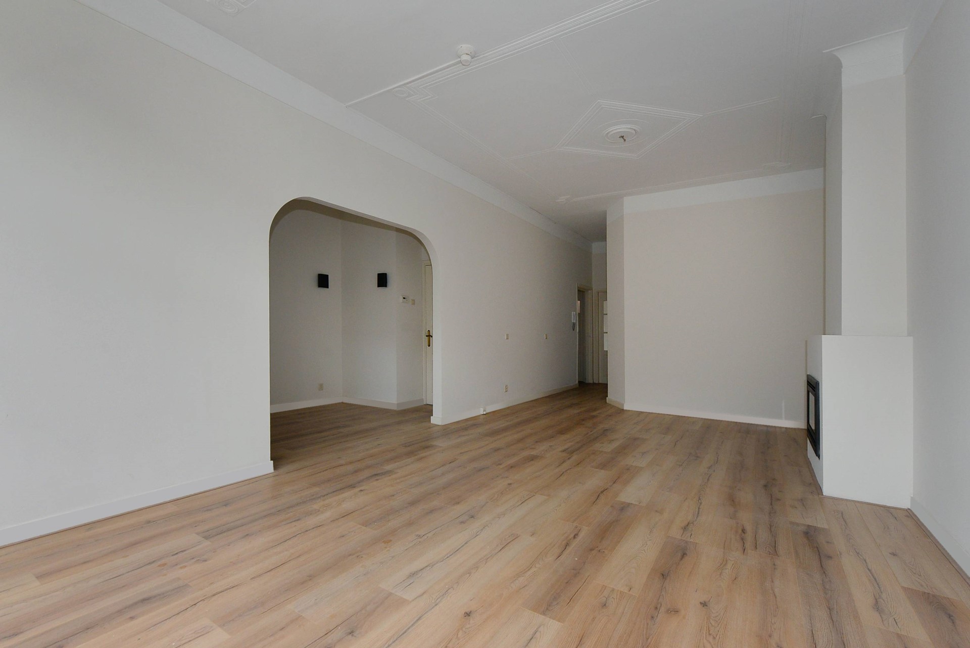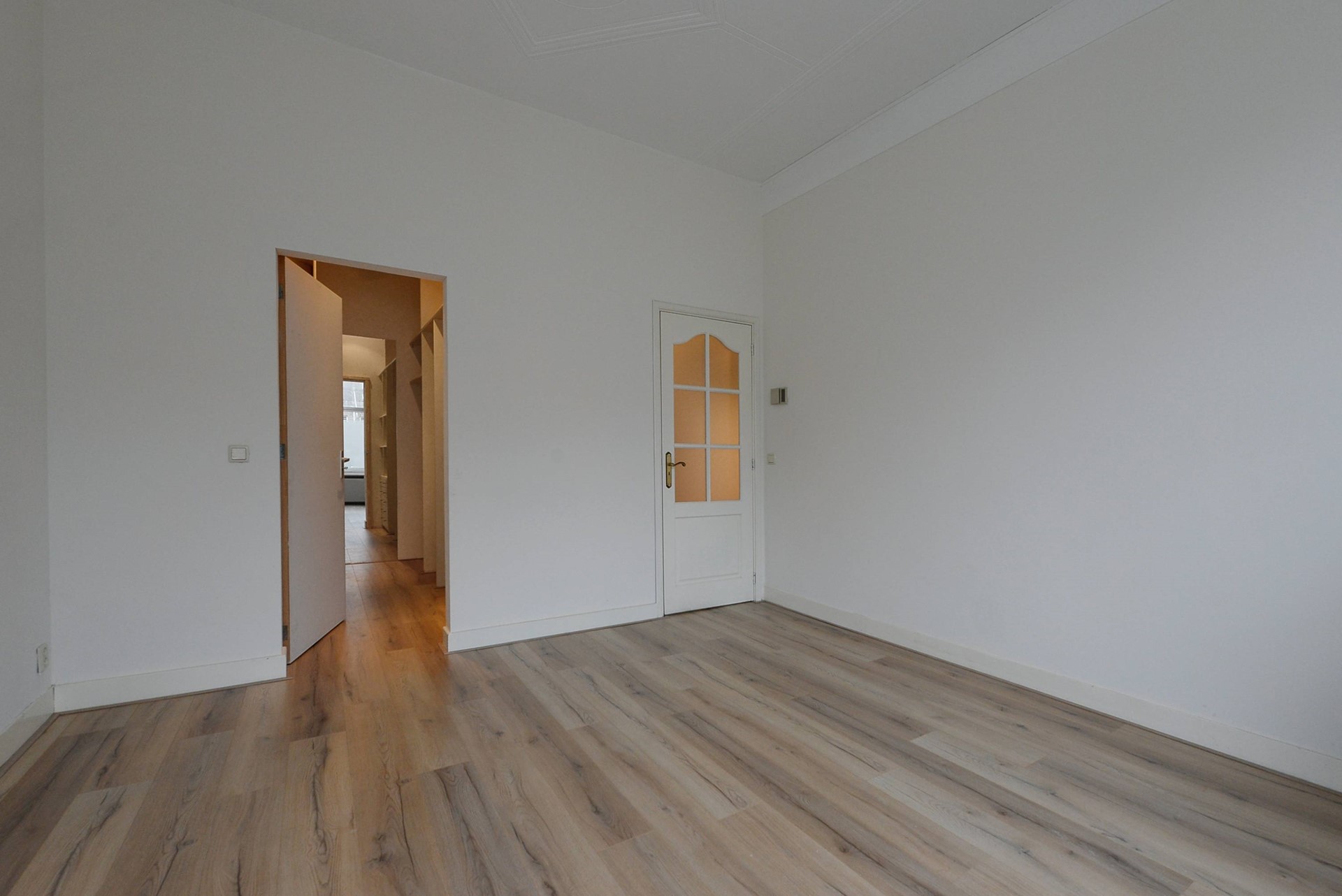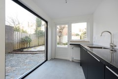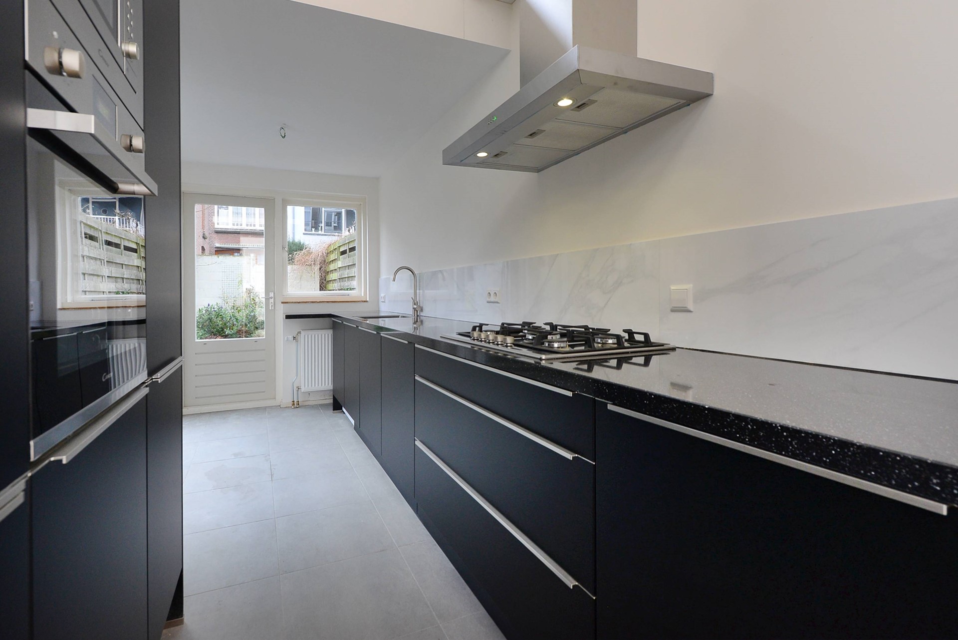 De gang met garderobe komt uit in de ruime en zeer lichte woonkamer die uitkijkt op de tuin. De moderne keuken heeft een volledige aanvulling van apparatuur zoals; koelkast, vriezer, vaatwasser, combi-oven, wasmachine, gasfornuis en afzuigkap. De zwarte kasten, luxe aanrechtblad en hardstenen vloer maken het geheel tot een moderne en strakke keuken. De ruime slaapkamer aan de voorzijde van het appartement verwent de huurder met een grote inloopkast. De badkamer is voorzien van een douche, ligbad, wastafel en toilet.