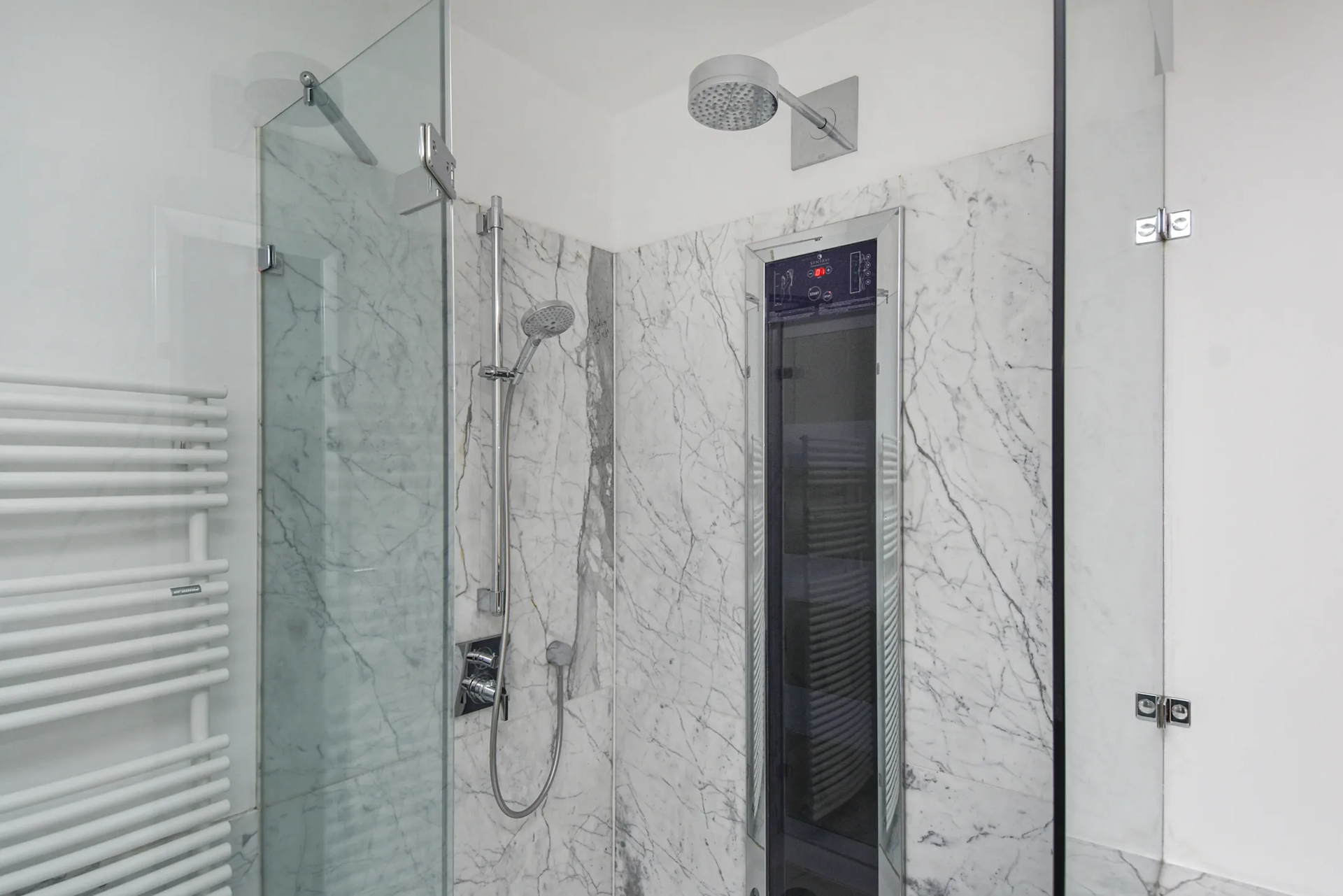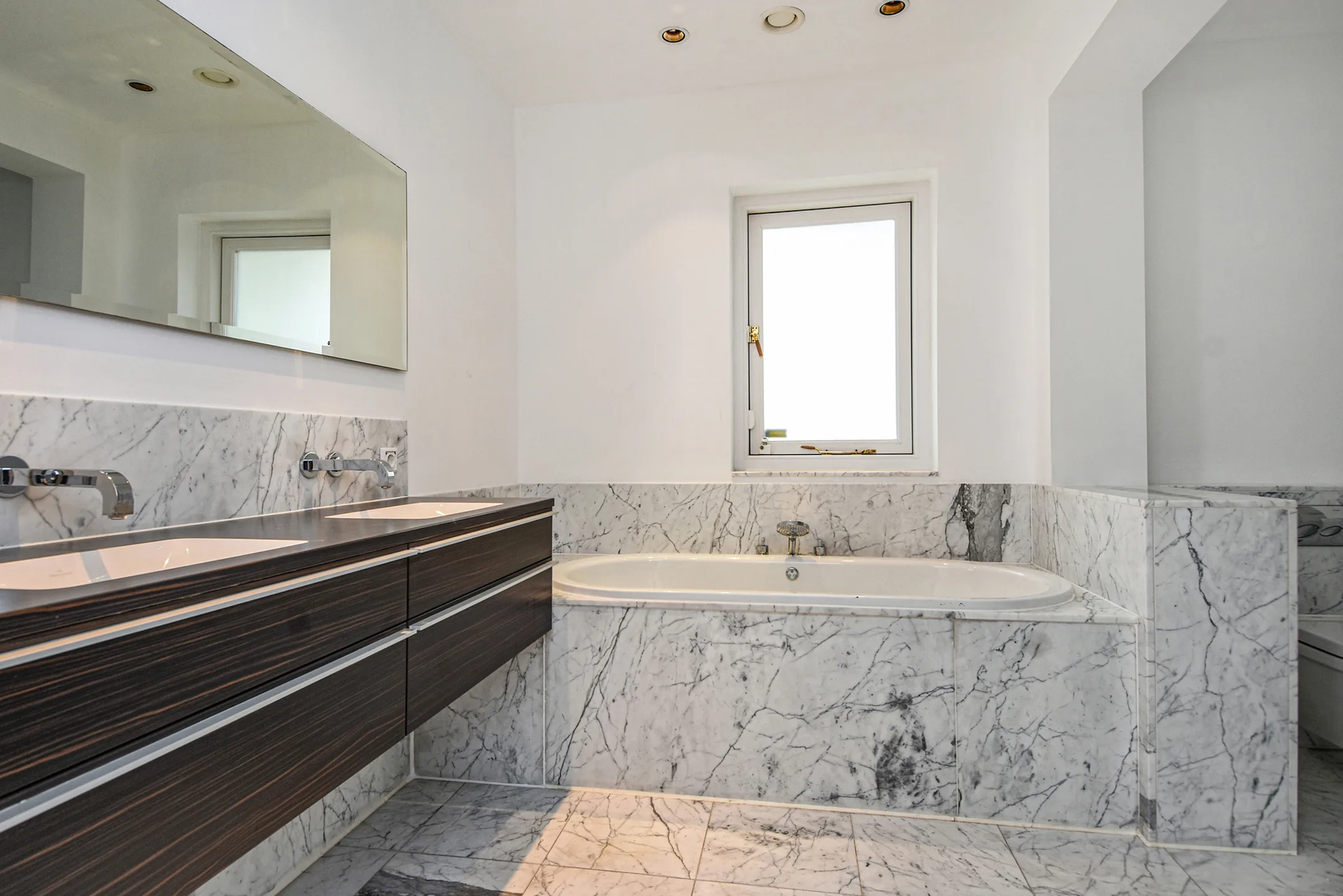 De hoofdslaapkamer biedt rust en comfort en beschikt over een walk-in closet. De badkamer is luxe uitgevoerd met natuurstenen tegels, een ligbad met temperatuurregeling, een separate douche met infrarood sauna element, toilet en hoogwaardig sanitair.