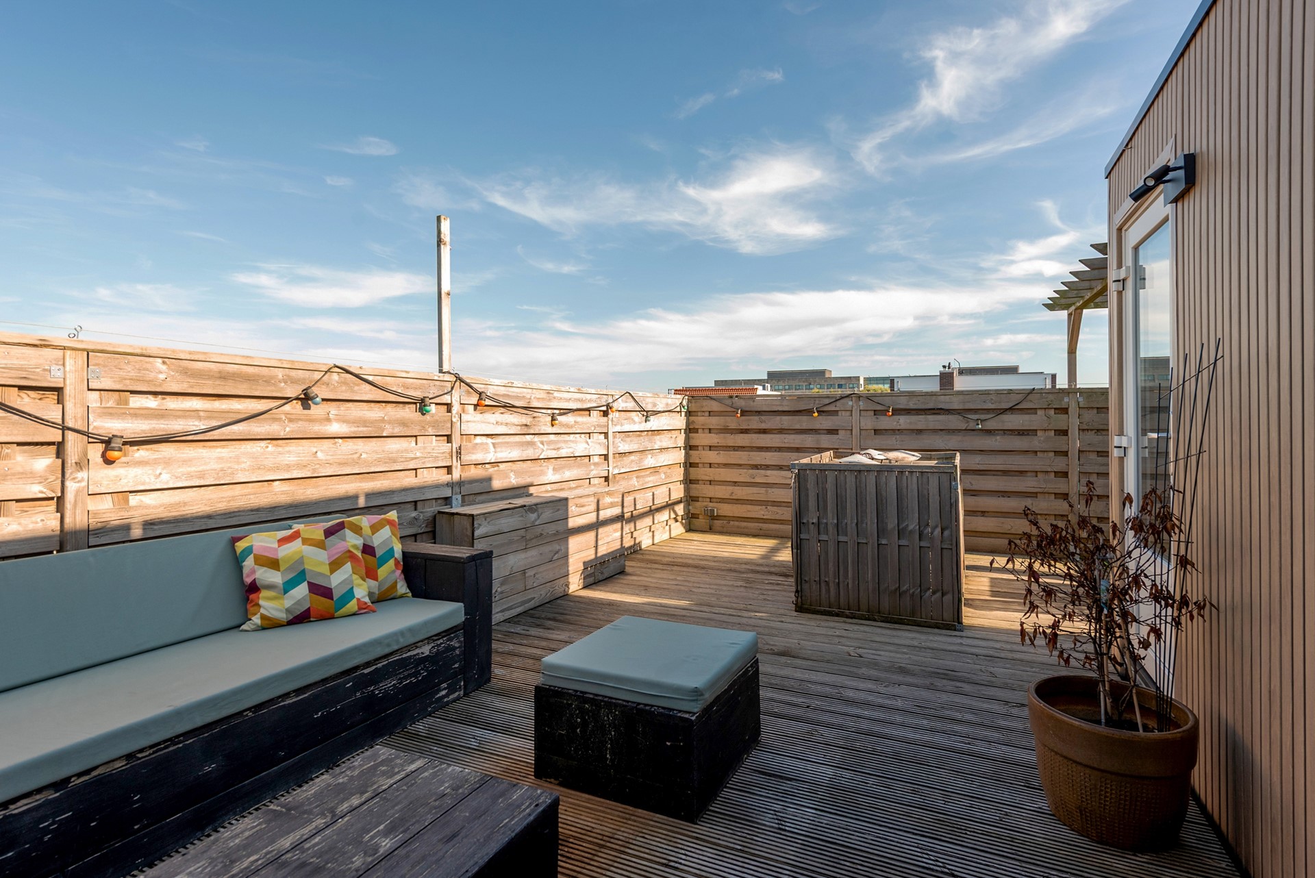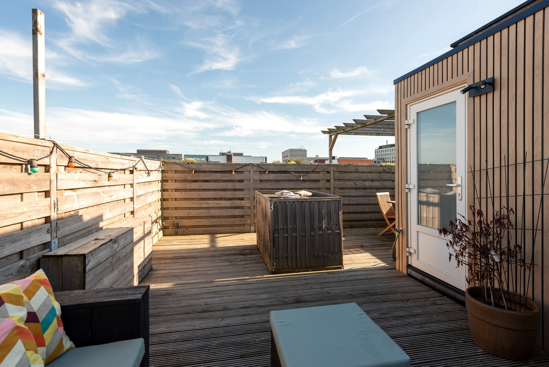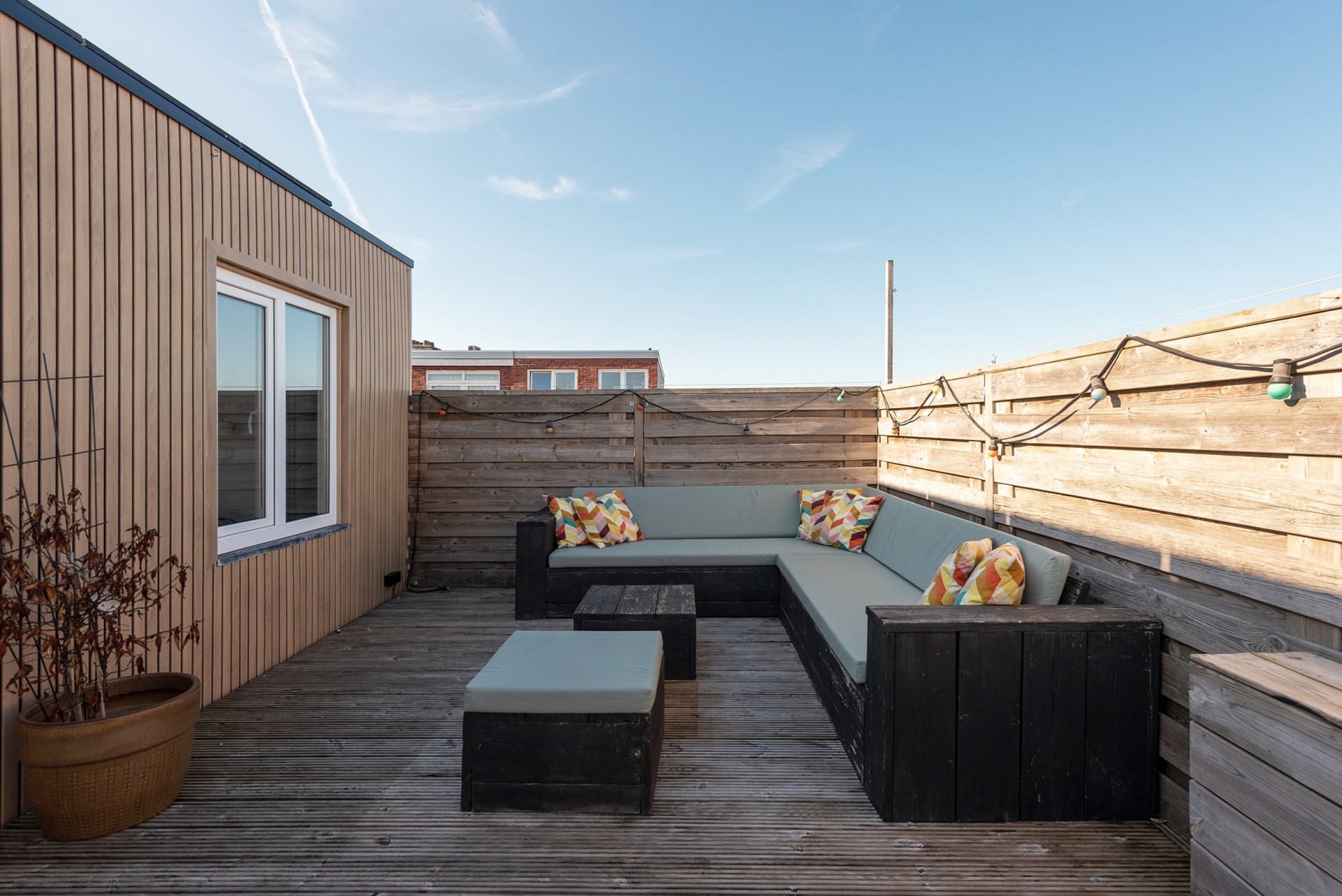 Via een open trap in de woonkamer is de bovenste verdieping te bereiken, waar zich de tweede ruime slaapkamer bevindt. Deze verdieping biedt ook toegang tot het royale en zonnige dakterras. Een ideale plek voor ontspanning of een diner in de open lucht.