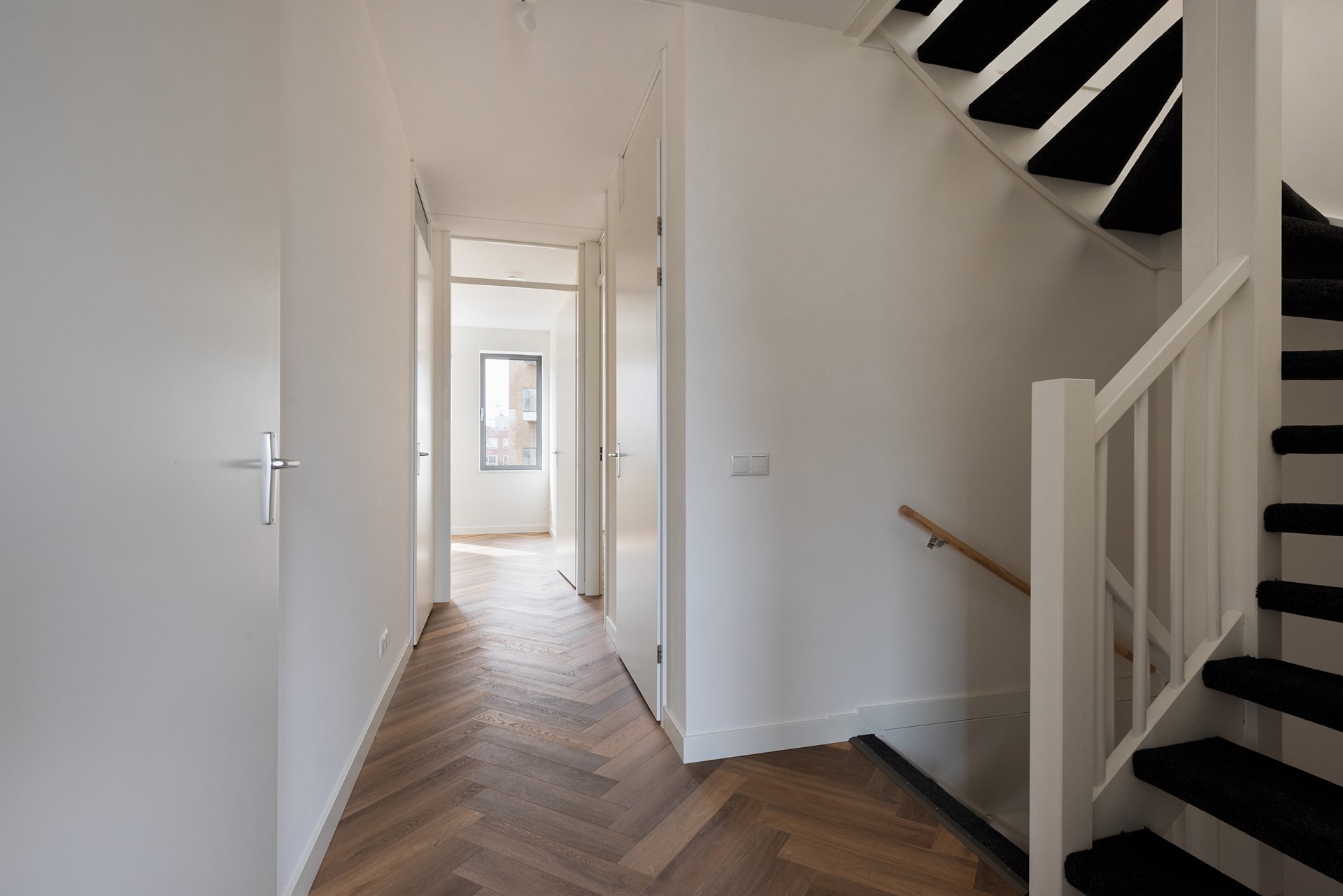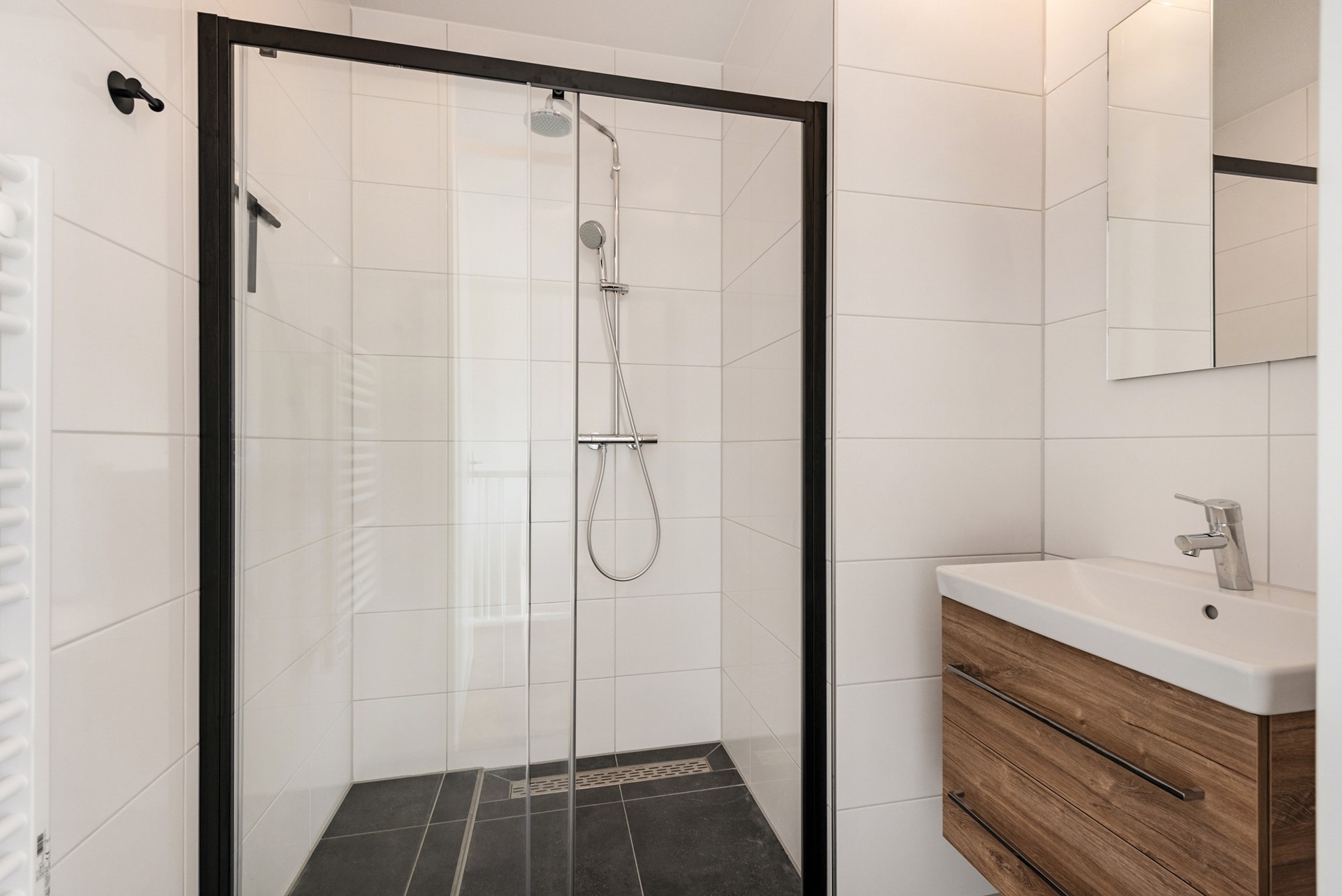 Op de tweede verdieping bevinden zich drie slaapkamers: twee aan de achterzijde en een royale slaapkamer aan de voorzijde. Centraal ligt de moderne badkamer, voorzien van een inloopdouche, wastafelmeubel en toilet. Daarnaast is er op deze verdieping een praktische wasruimte met aansluitingen voor wasmachine en droger.