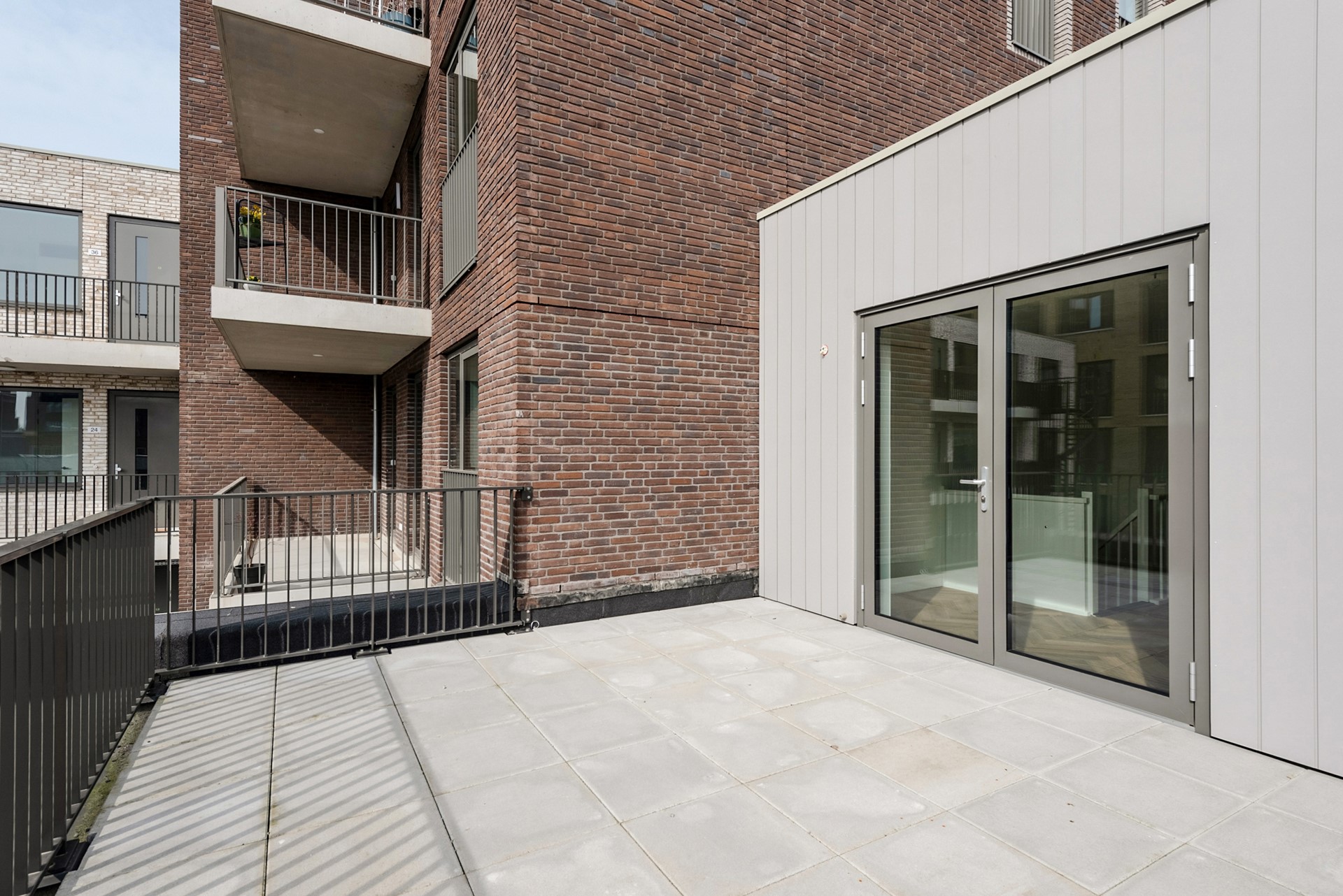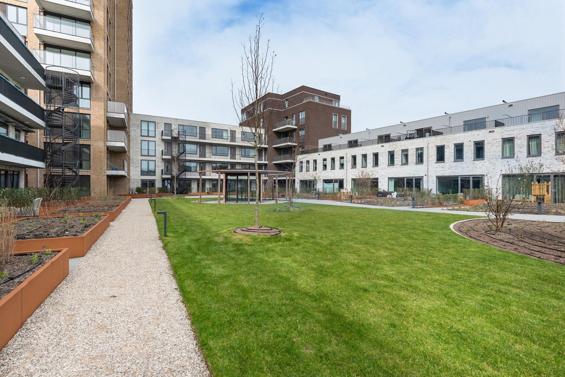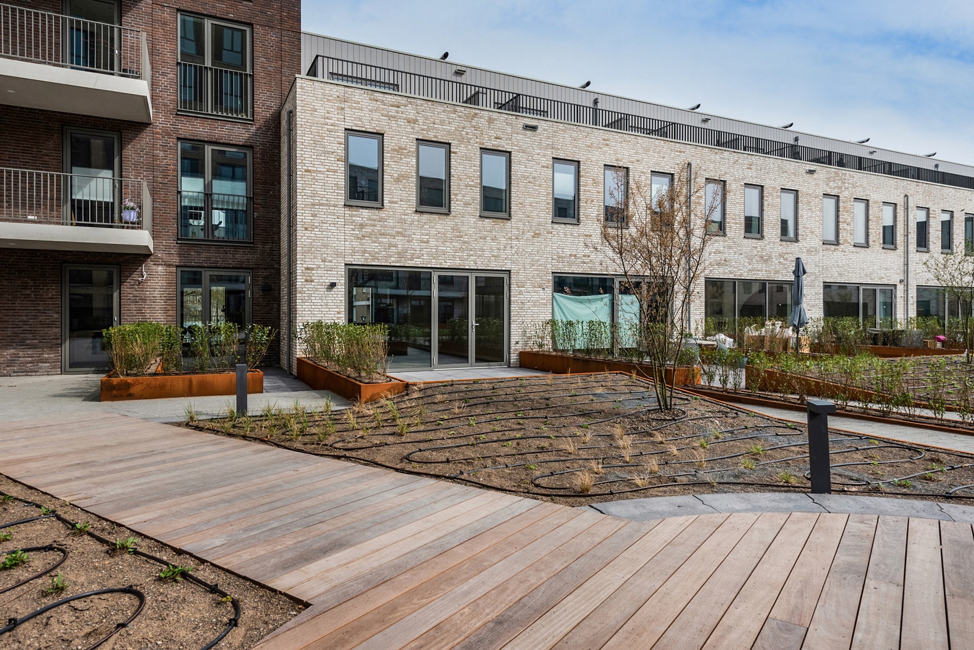 Vanuit de woonkamer heb je direct toegang tot de zonnige tuin. De tuinen van dit project komen samen in een groene, gezamenlijke binnenplaats, wat zorgt voor een ruimtelijk en speels geheel.