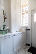 The impressive entrance with richly detailed ornaments and original flooring immediately sets the tone. The hall offers storage space under the stairs, access to a modern toilet and the basement.