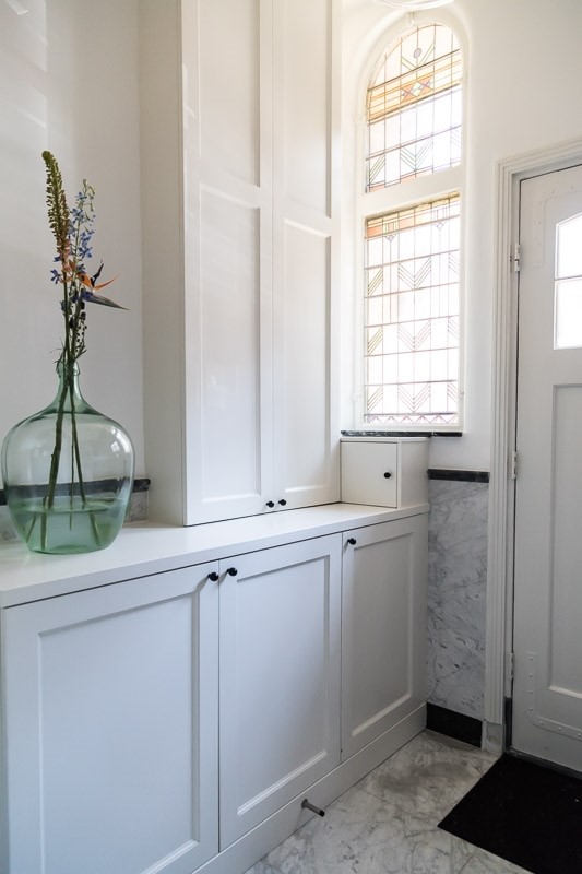 De imposante entree met rijk gedetailleerde ornamenten en originele vloer zet direct de toon. De hal biedt bergruimte onder de trap, toegang tot een modern toilet en de kelder.