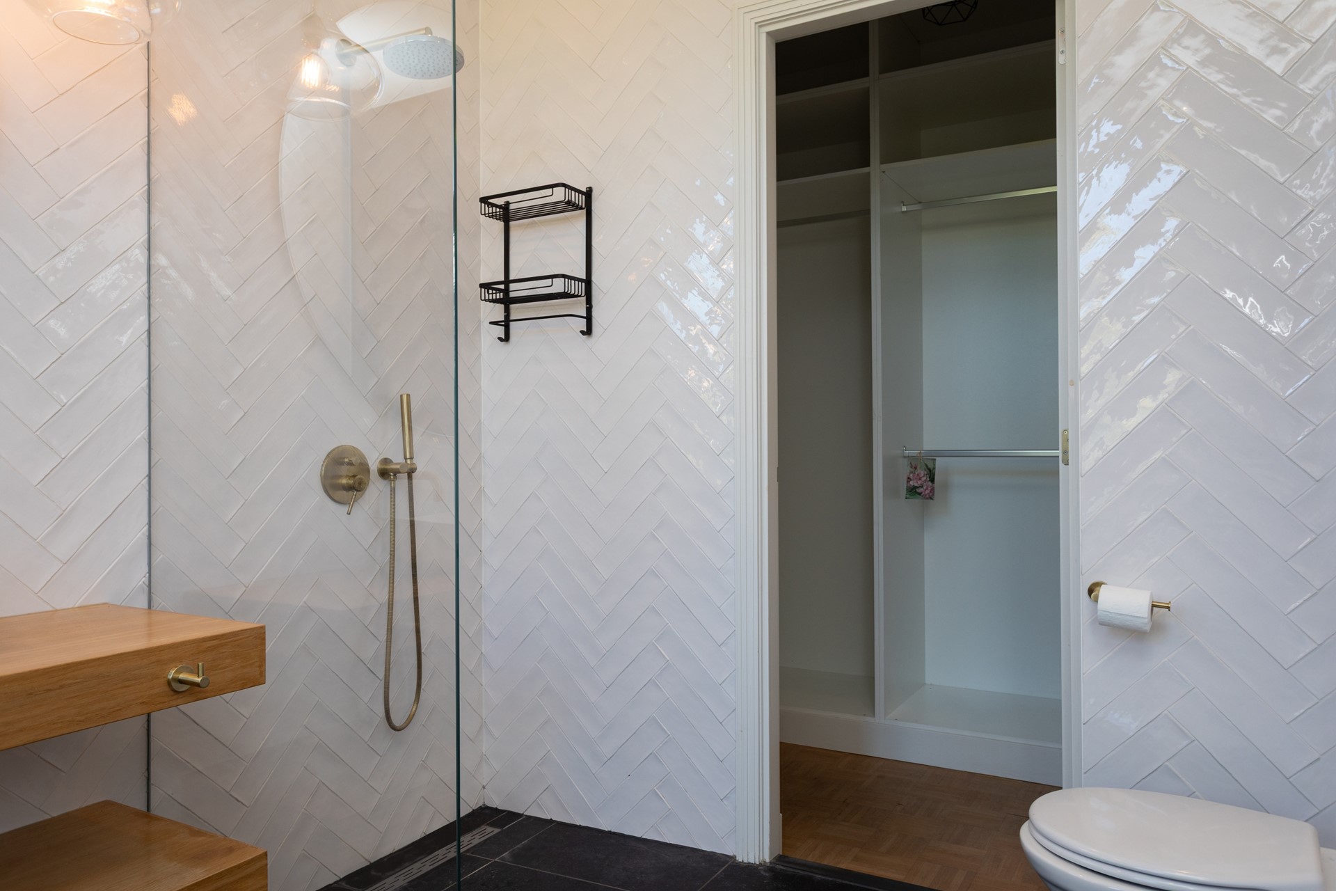 Ruime badkamer met inloopdouche, dubbele wastafel, handdoekradiator en inbouwkast. Via openslaande deuren toegang tot een royaal, zonnig terras.