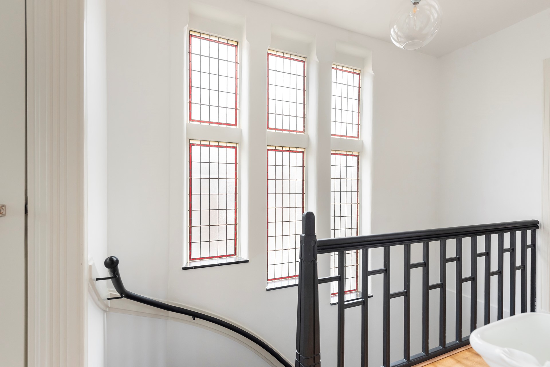 De statige trap met prachtig trappenhuis brengt u naar de eerste verdieping, waar originele details zoals ornamenten plafonds, schouwen, houten vloeren en paneeldeuren behouden zijn.