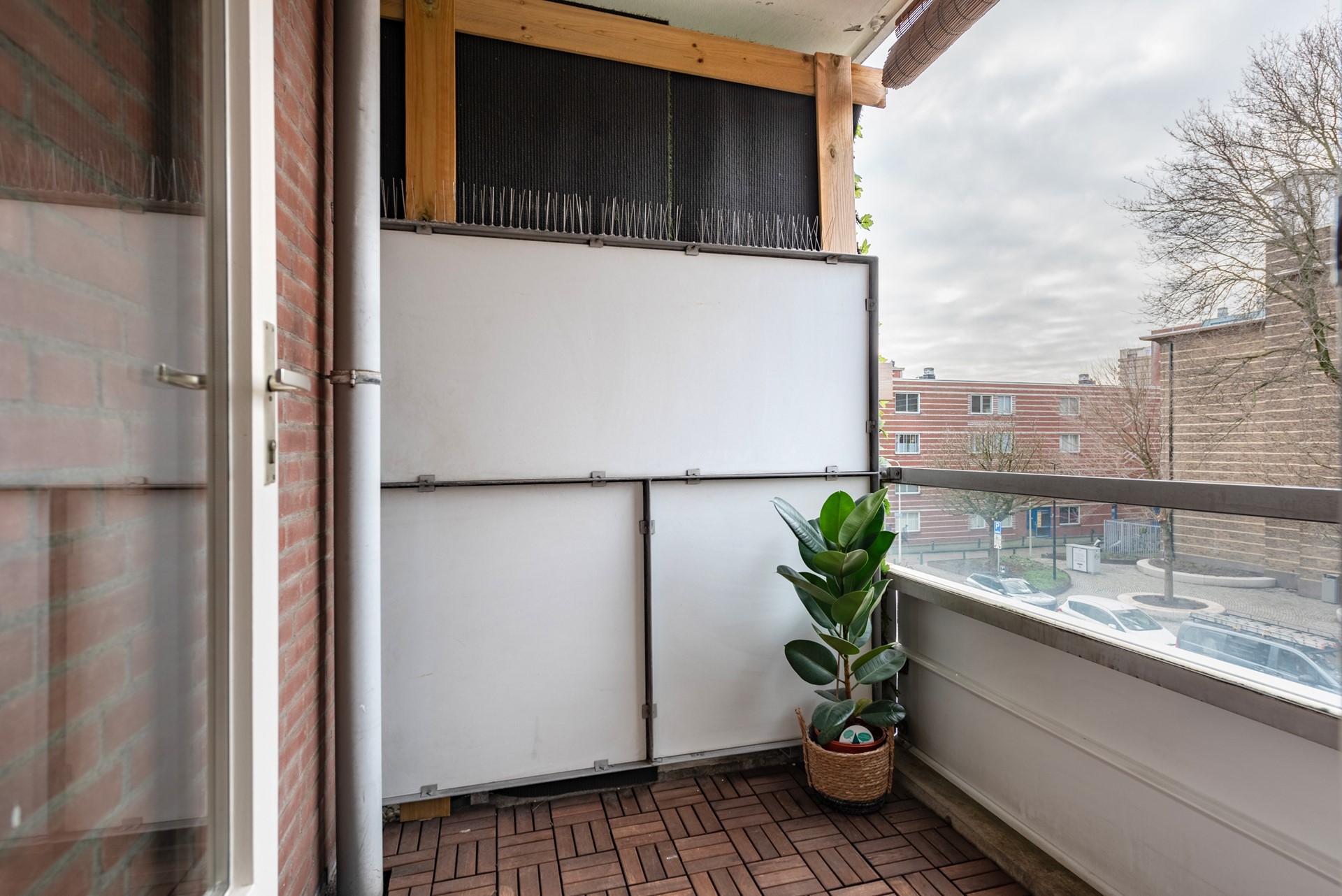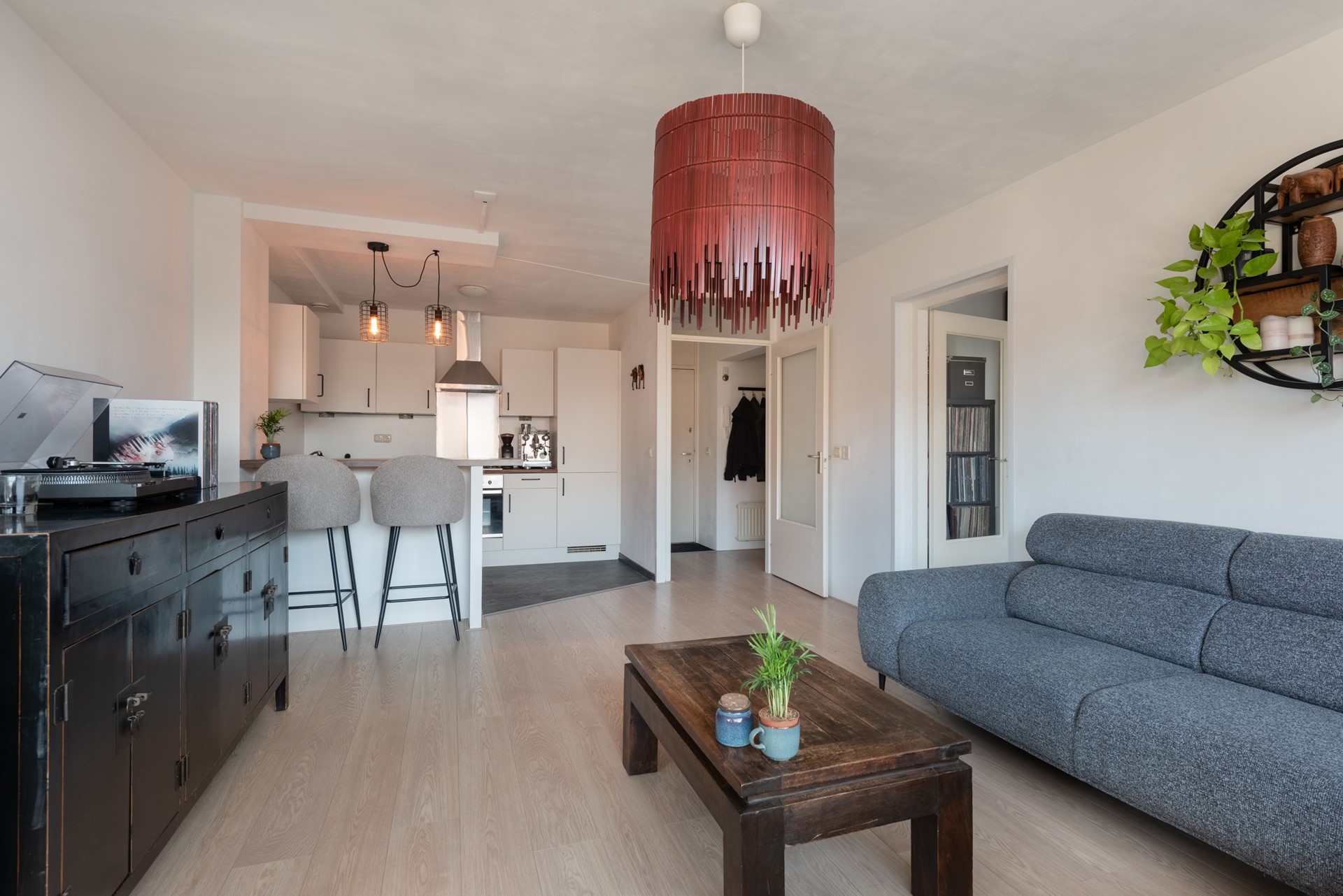 De woonkamer is aangenaam licht dankzij het grote raam met vrij uitzicht tussen de omliggende bebouwing. De woonkamer biedt direct toegang tot het balkon gelegen op het zuidwesten.